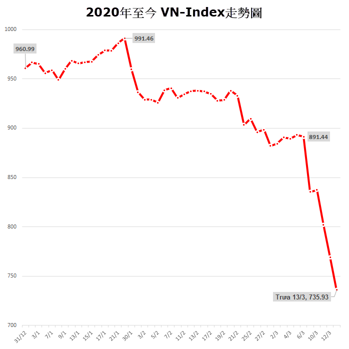 越股今(3/13)早盤跳空開低,下跌33點,終場收在735.9點, VN-Index 跌幅僅4.3%,比起跌幅超過 10% 的歐美市場來說跌幅不算大。