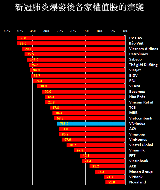 從農曆年過後市場就受到 Covid-19 新冠肺炎疫情影響 , 與農曆年前相比VN-Index 已下跌26%,而從今年(2020)初到現在則下跌23% , 各主要權值股比農曆年前下跌超過30% 。