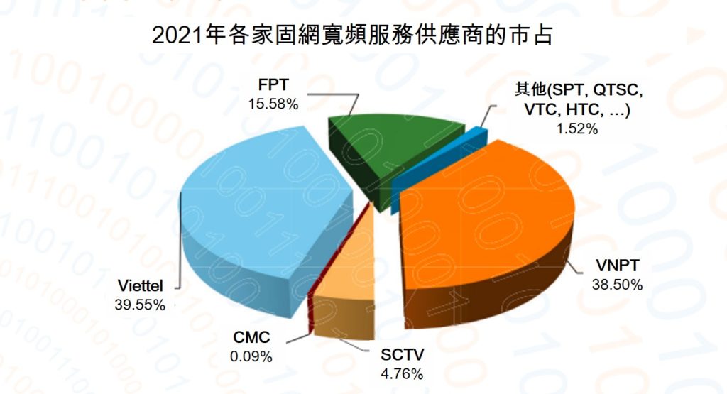 另根據2021年資訊技術白皮書,Viettel排名第1,固網寬頻服務市占39.55% ;第2名是VNPT,市占38.5%;FPT市占15.58%排名第3。