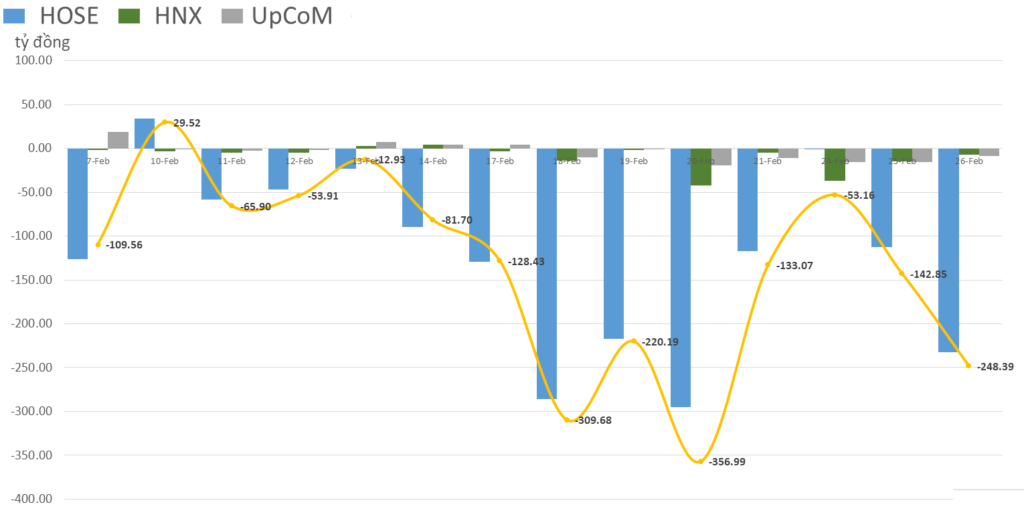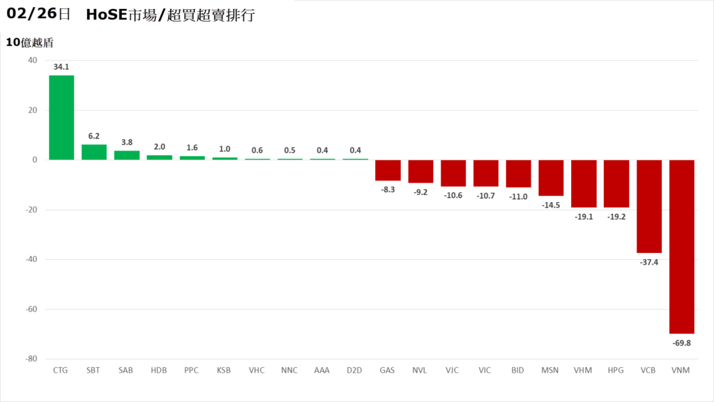 外資在三個市場超賣2,480億越盾。 在HOSE ,外資超賣2327.5億越盾。 其中VNM超賣約700億越盾,VCB超賣約 374億越盾, 使這兩檔股票各分別下跌2.78%和1.4%。