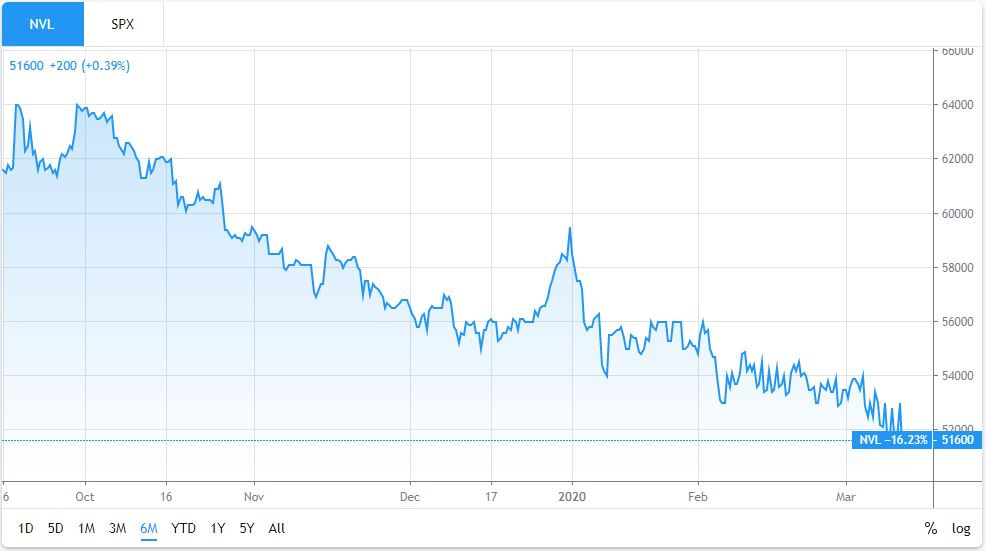 NVL 3/16日股價為每股51,600越盾,比2019年10月初下跌18%,市值為500,000億越盾