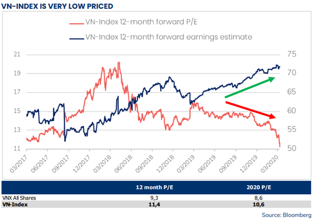 VN-Index 指數的 P/E 在2018年4月飄高後已迅速降溫。 根據越南的長期增長預測,越南股市合理的P / E為15。2020年初至今 VN-Index 的P / E 已降至10.6且Vietnam AllShares Index的 P / E也只有 8.6 , 可見越南股市目前出現大量意想不到的便宜股票,甚至有些股票的 P / E 僅有6。但彭博社( Bloomberg )也估計, 在近期 , 視行業而定,上 市公司的利潤成長將變得緩慢。