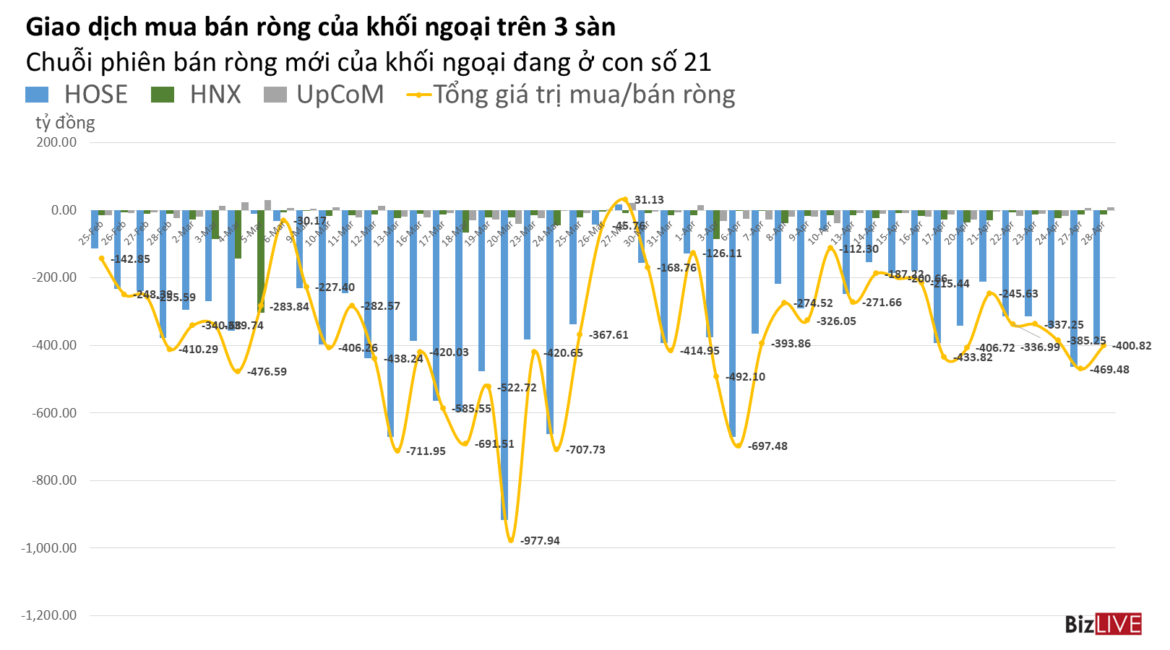 3市場外資超賣共4,008.2億越盾;HOSE和HNX市場超賣分別為 3,966.5和126.2億越盾,唯UPCoM市場買超 84.5億越盾。