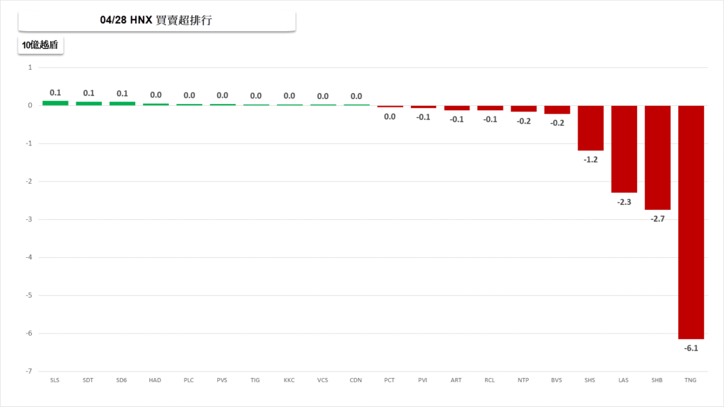 外資在HNX市場上超賣的前 3名是TNG(-61億越盾)、SHB(-27億越盾)、LAS(-23億越盾)。
