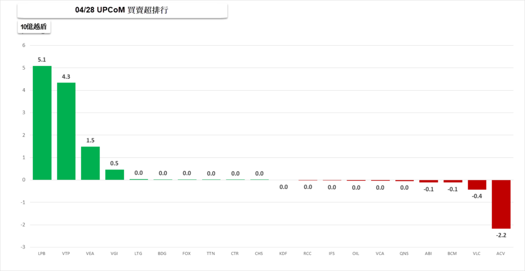 UPCoM市場今天出現買超,應歸功於LPB(+51億越盾),VTP(+43億越盾)。